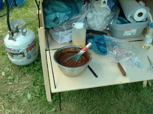 Generally, you can cook almost anything in a dutch oven that you can cook in a regular oven. The following recipe is from the back of a can of Hershey's Cocoa (it is also featured on their website as well). While you can just follow the normal recipe, I have modified the it to make it easier to cook it while camping. The key was in the packaging of the ingredients. In my case, I had to send the recipe pre-packaged with some scouts unfamiliar with dutch oven cooking. The wet ingredients are pre-mixed, as are the dry ingredients. A cup of boiling water will also be needed (my group heated the water on top of the charcoal starter).